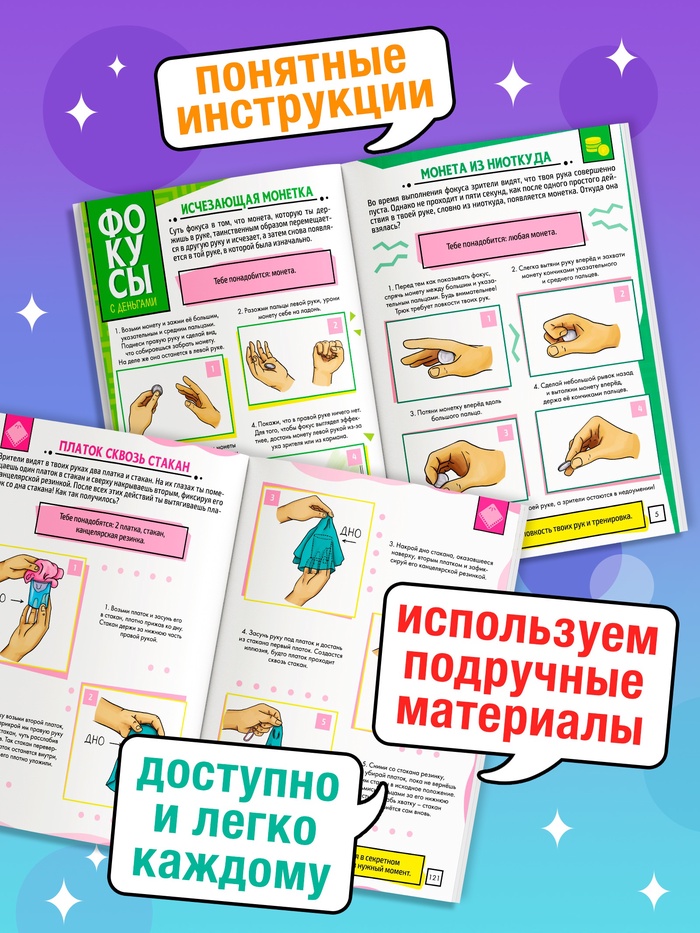 - Пошаговые инструкции в картинках помогают ребёнку легко разобраться с каждым фокусом, даже если он только начинает учиться.