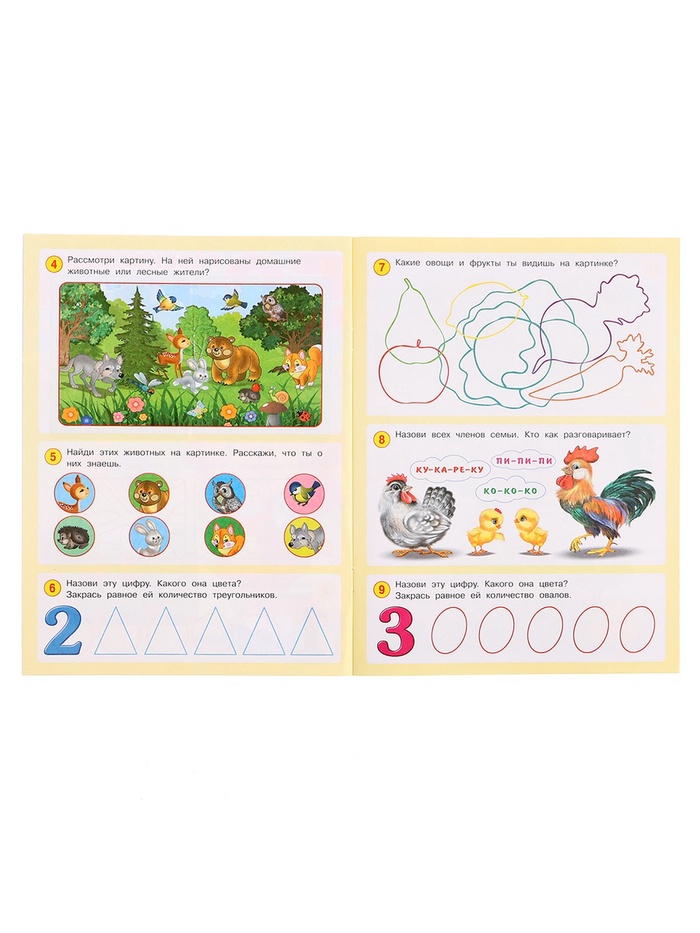 - Тематика охватывает буквы, цифры, геометрические фигуры, цвета, времена года и животных, формируя целостное представление об окружающем мире.