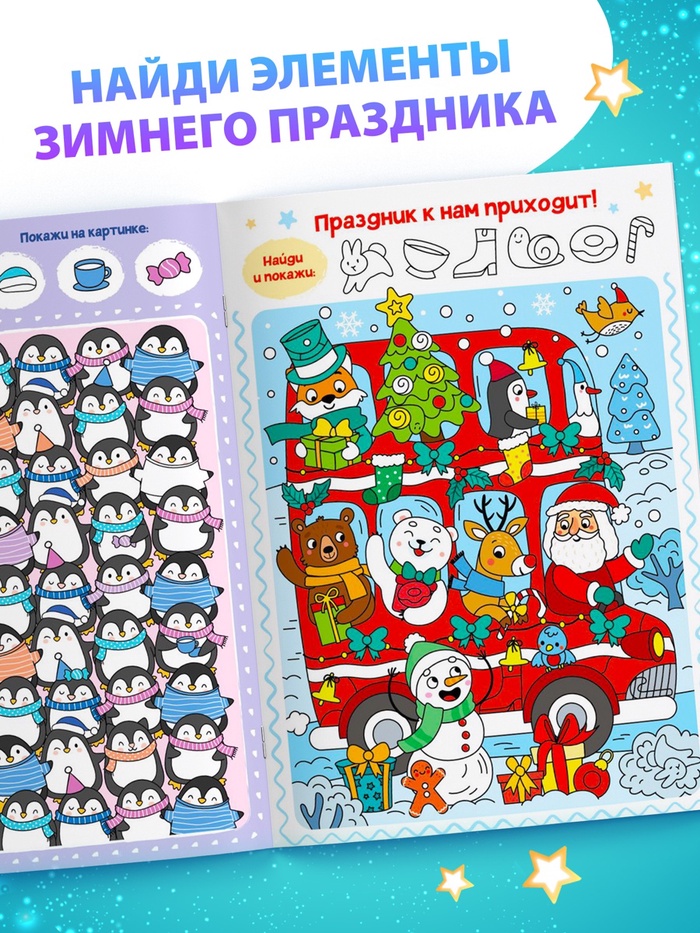Эта книга напоминает волшебную коробку с загадками, где каждая страница — это новое приключение. Ребёнок словно становится охотником за сокровищами, который разыскивает спрятанные новогодние элементы. Это похоже на игру в прятки, только вместо случайных попыток — внимательный поиск, а результат всегда вызывает радость и удовлетворение.
