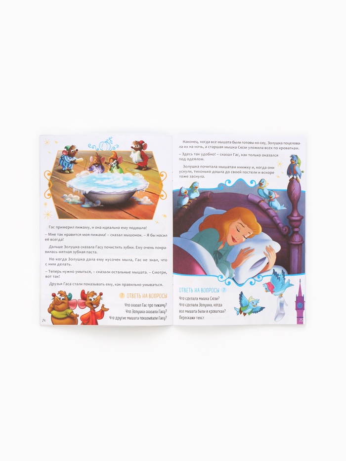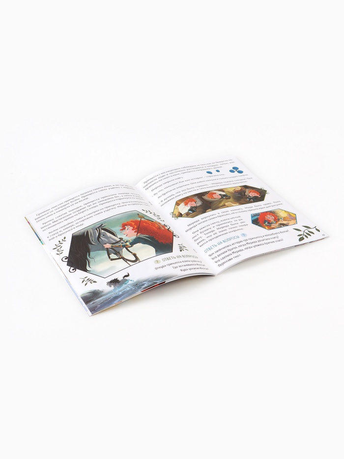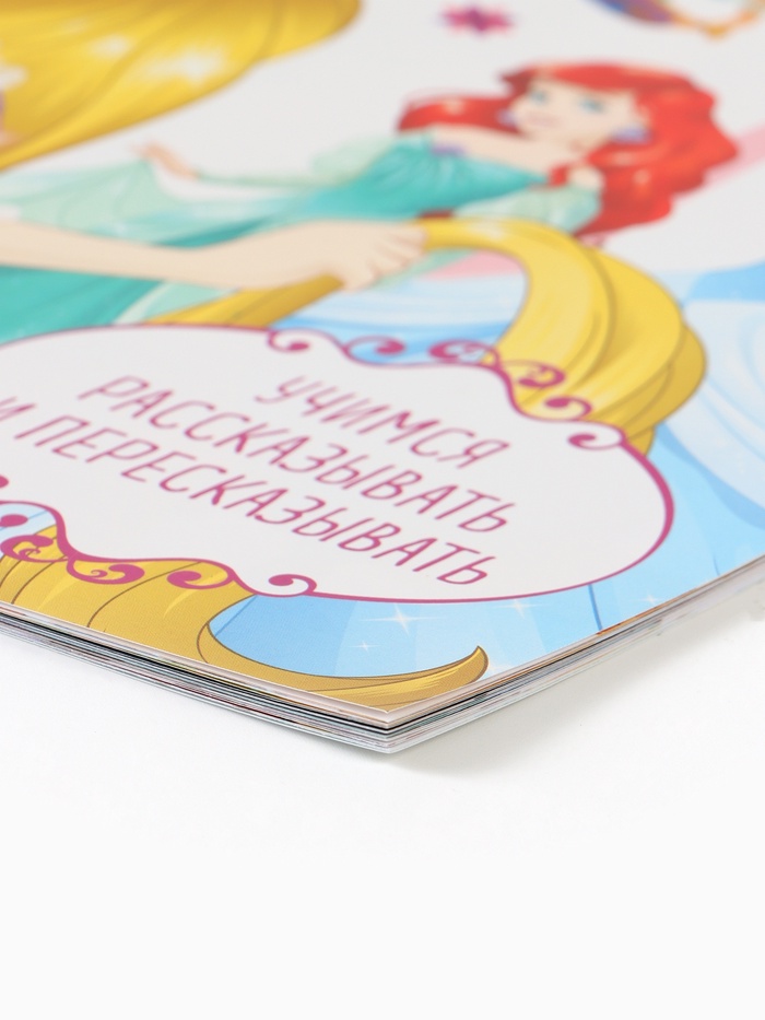 - 32 страницы с милыми историями о принцессах, таких как Рапунцель, Мерида и Ариэль, которые знакомы каждому ребёнку.