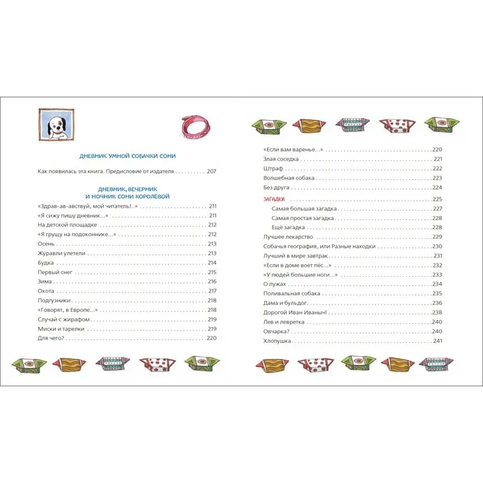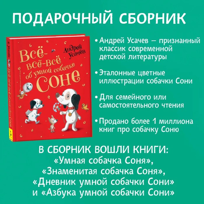 Книга «Всё-всё-всё об умной собачке Соне» — это сборник увлекательных историй для детей от 3 лет, созданный Андреем Усачевым. 260 страниц с яркими иллюстрациями Евгения Антоненкова погружают читателя в мир обаятельной и остроумной героини, которую любят и дети, и взрослые.