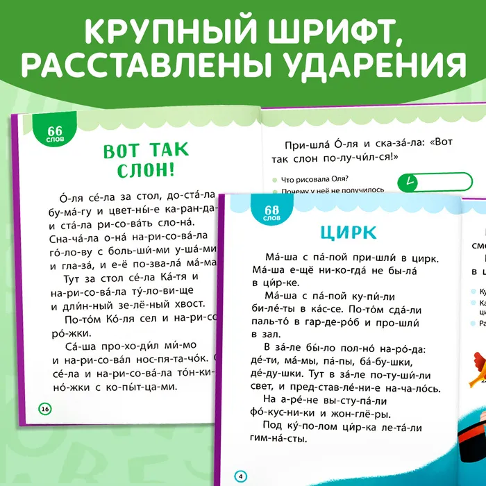 - Книга содержит простые и понятные тексты, это облегчает восприятие и повышает уверенность ребёнка в чтении.