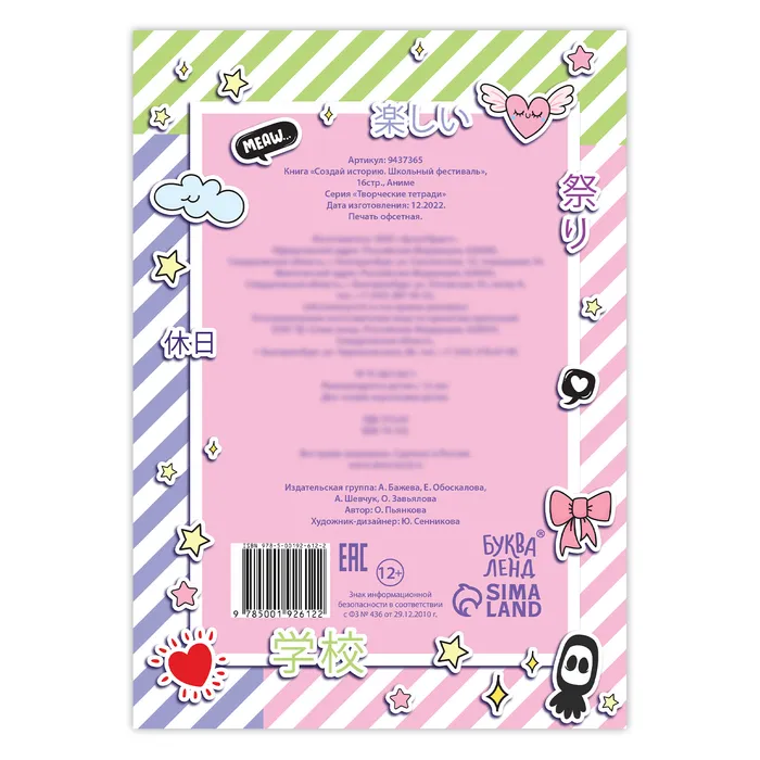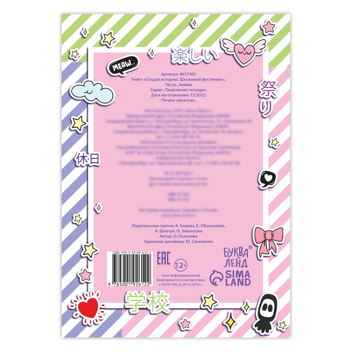 Погрузитесь в мир школьных фестивалей и придумайте собственную историю! Изучите всех персонажей, а затем расскажите на страницах книги об их приключениях. Будет ли история счастливой? Может, произойдёт что-то волшебное? Или же это будет романтическая сказка? Решать только вам!