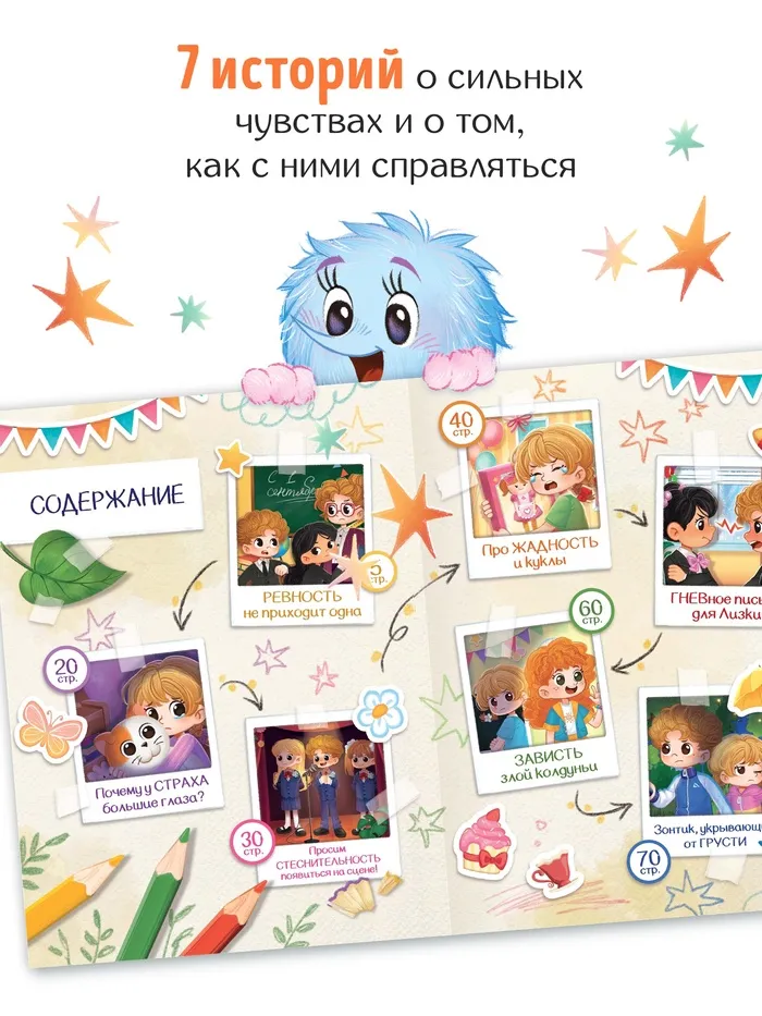 - 7 терапевтических историй о распространённых эмоциях: злость, одиночество, тревога, ревность, страх и другие.