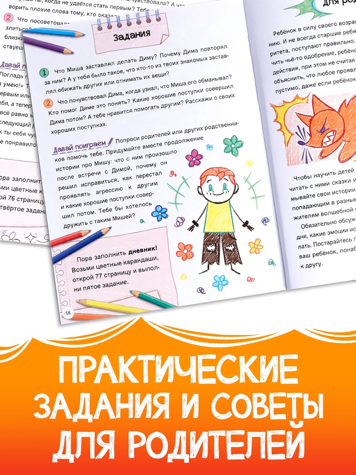 - 80 страниц удобного формата с историями о типичных детских ситуациях: конфликты, стресс, усталость.