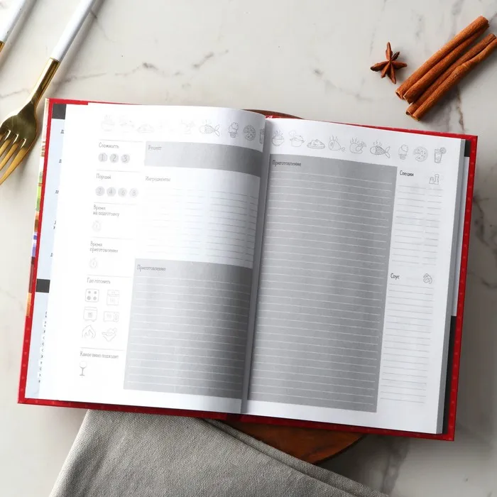 Ежедневник для записи рецептов - Отличный помощник на кухне, он всегда будет под рукой, в отличие от любых электронных аналогов. Записи позволят не забыть про удачный рецепт, который снова захотите повторить. Для удобства использования, вы можете отмечать сложность, время приготовления, где готовится и количество порций, для каждого рецепта, а так же записывать весь процесс приготовления. Благодаря твердой обложке он прослужит долгие годы. А универсальный формат, не займет много места на вашей кухне.