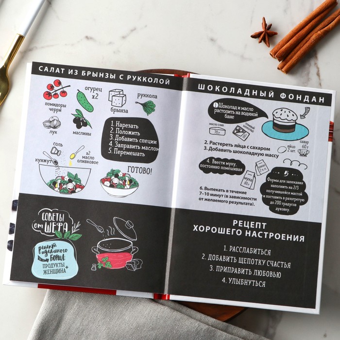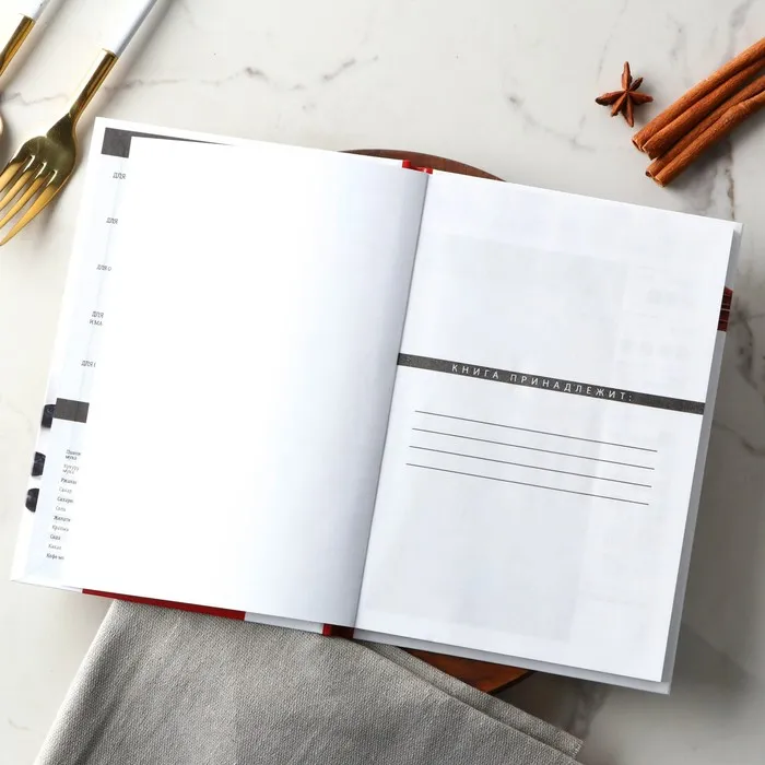 Ежедневник для записи рецептов - Отличный помощник на кухне, он всегда будет под рукой, в отличие от любых электронных аналогов. Записи позволят не забыть про удачный рецепт, который снова захотите повторить. Для удобства использования, вы можете отмечать сложность, время приготовления, где готовится и количество порций, для каждого рецепта, а так же записывать весь процесс приготовления. Благодаря твердой обложке он прослужит долгие годы. А универсальный формат, не займет много места на вашей кухне.