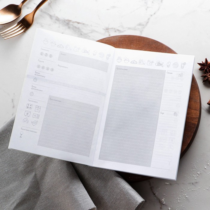 Кулинарная книга - Отличный помощник на кухне, она всегда будет под рукой, в отличие от любых электронных аналогов. Записи позволят не забыть про удачный рецепт, который снова захотите повторить. Для удобства использования, в книге вы можете отмечать сложность, время приготовления, где готовится и количество порций, для каждого рецепта, а так же записывать весь процесс приготовления. Благодаря твердой обложке, книга прослужит долгие годы. А универсальный формат, не займет много места на вашей кухне.