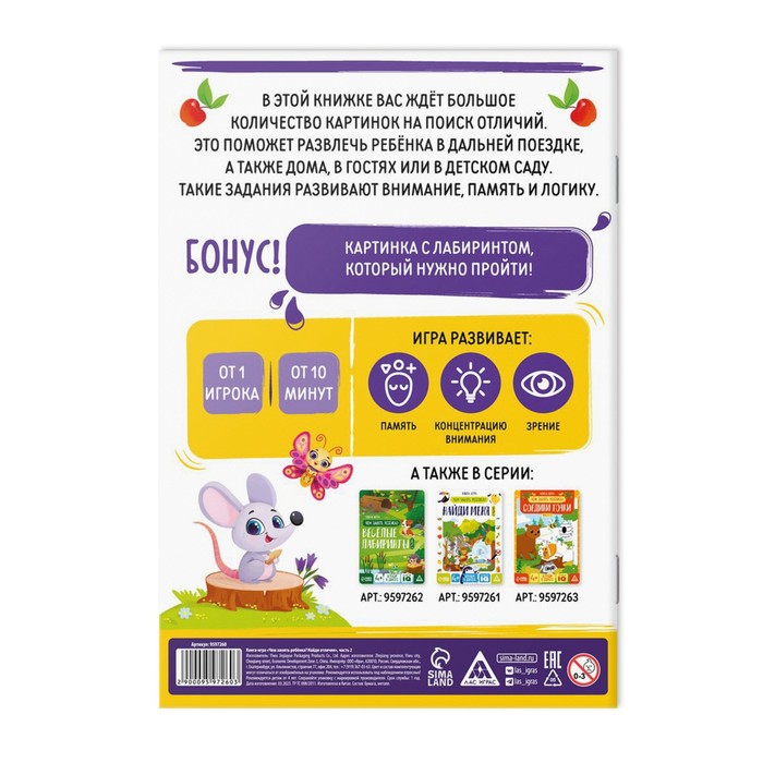 В этой книжке вас ждёт большое количество картинок на поиск отличий. Это поможет развлечь ребёнка в дальней поездке, а также дома, в гостях, или в детском саду.
