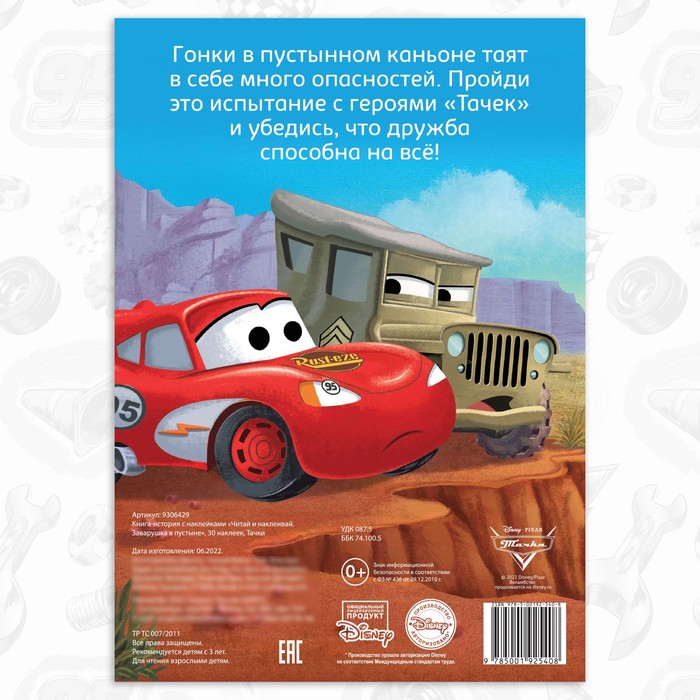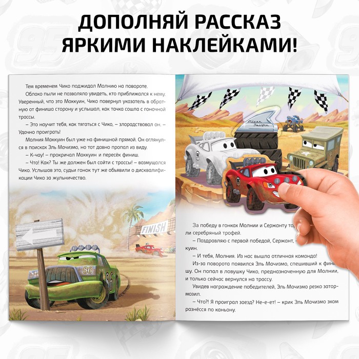 - В книге есть 30 цветных наклеек с любимыми персонажами из мультфильма «Тачки».