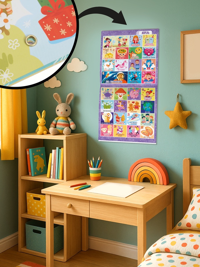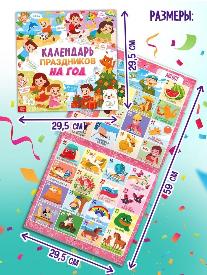 - Календарь включает все праздники, которые отмечаются в стране и мире, помогая детям узнавать о традициях и событиях.