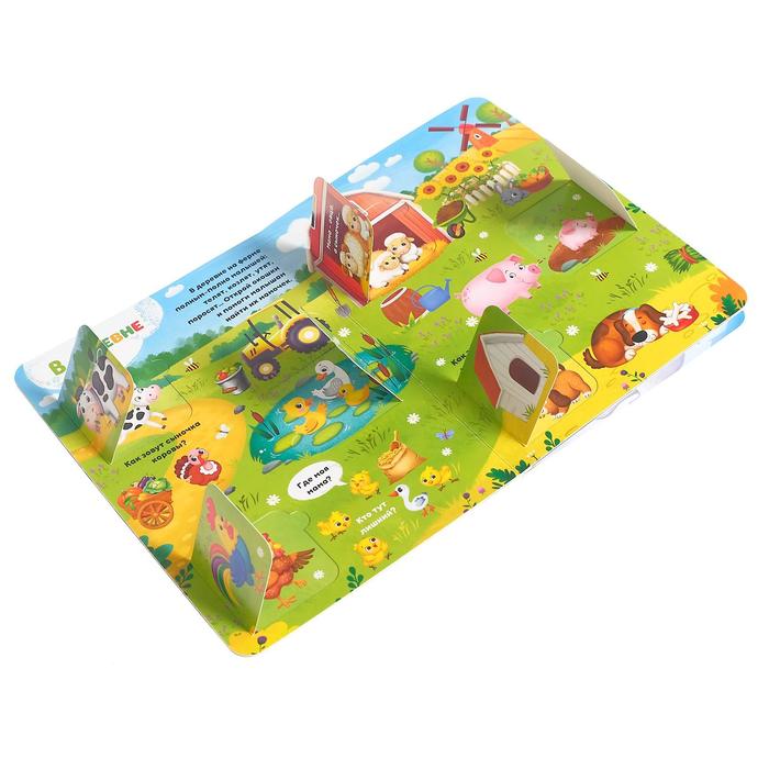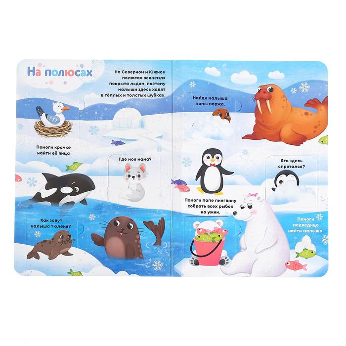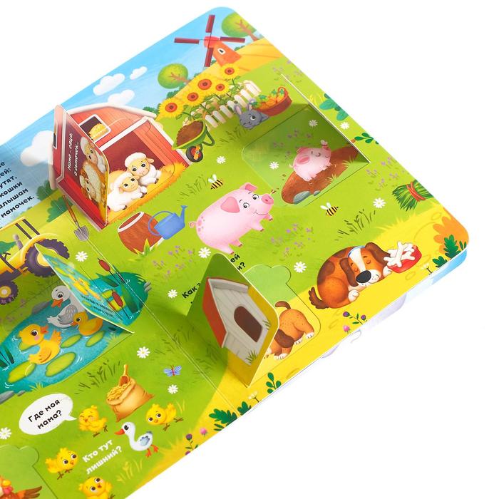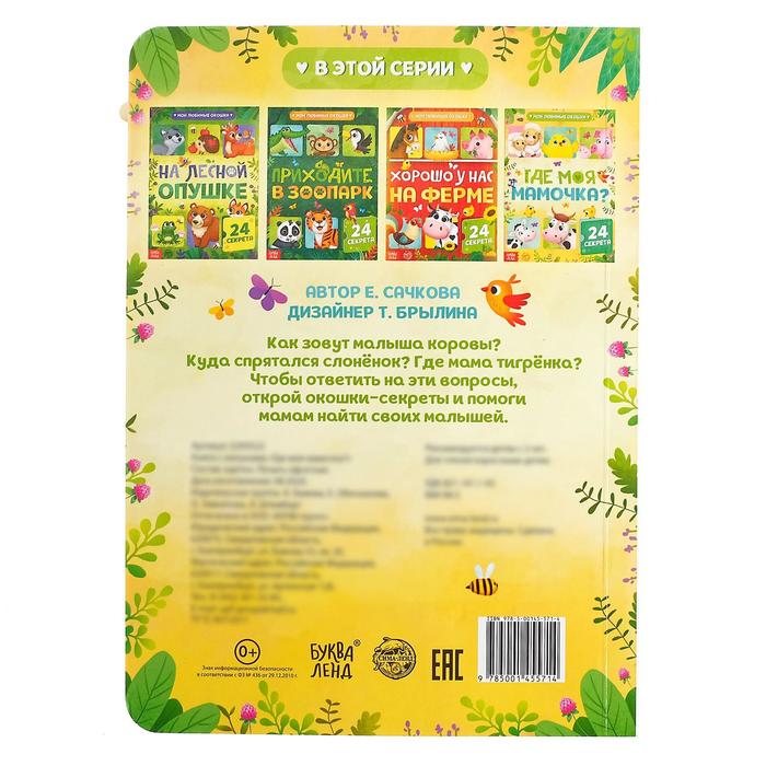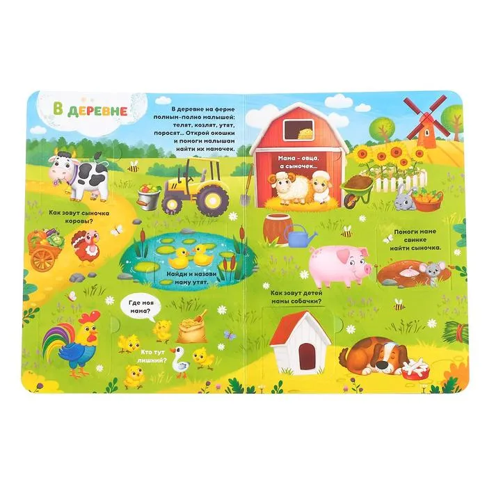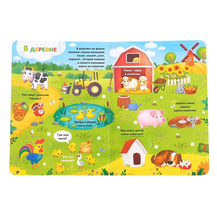 На страницах книги обитают мамы и их детки. А ещё есть много интересных вопросов о животных. Ответить на них очень просто — достаточно посмотреть, кто спрятался в окошке.
