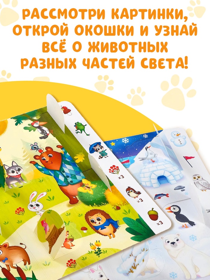 Книга сделана из плотного картона, поэтому прослужит долго. Внутри ребёнок найдёт 32 окошка с яркими изображениями животных. Также в книжке есть интересные задания, типа «Найди и покажи».