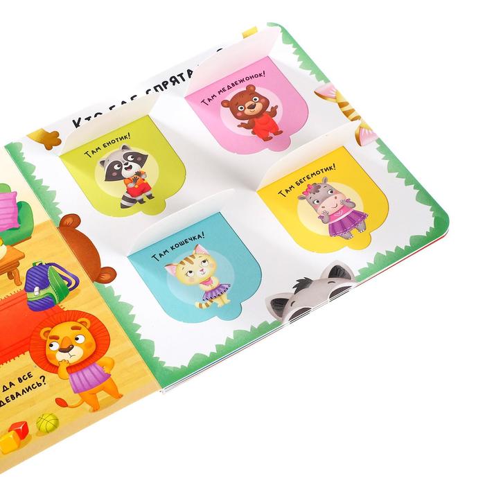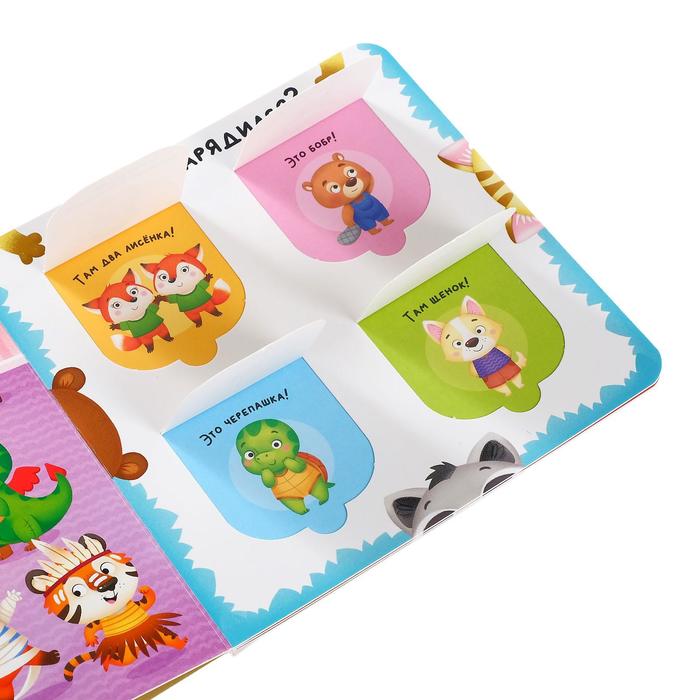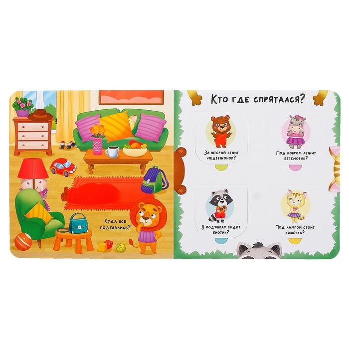 Книга сделана из плотного картона, поэтому прослужит долго. Внутри ребёнок найдёт 16 окошек с яркими изображениями животных. Также в книжке есть интересные логические задания и игра «Найди и покажи».