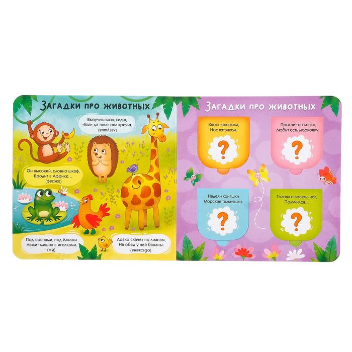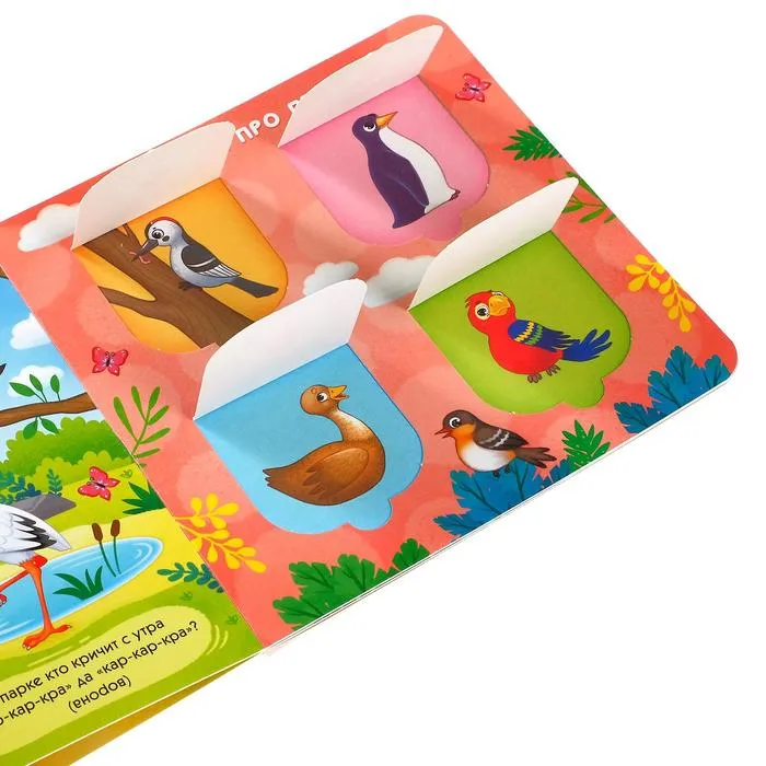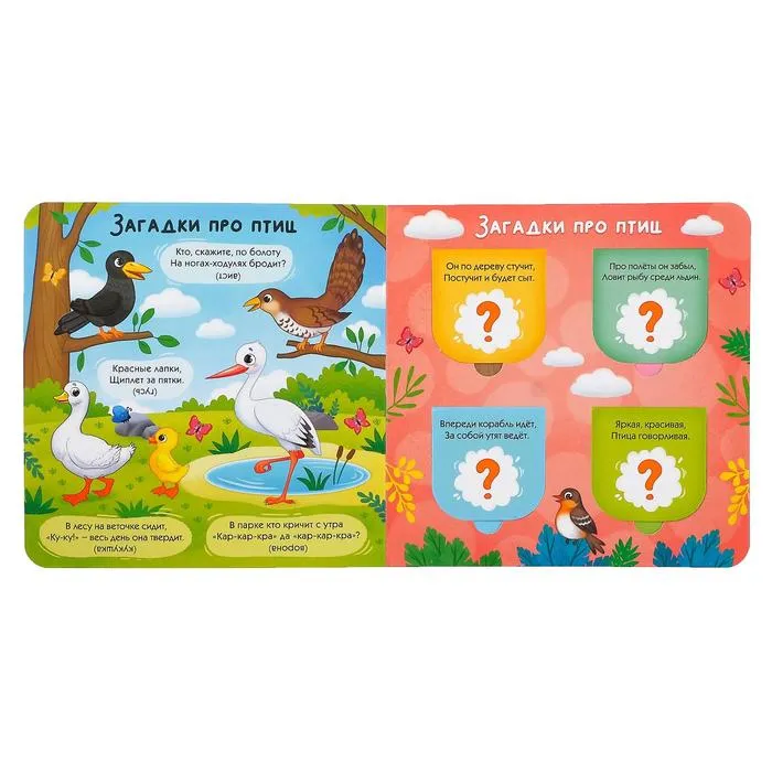 Книга сделана из плотного картона, поэтому прослужит долго. Внутри ребёнок найдёт 16 окошек с загадками про животных и птиц.