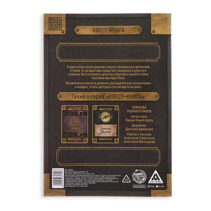 У вас в руках дневник самого гениального детектива XXI века. И вам предстоит оказаться в роли его ученика. Восстановите цепочку событий и узнайте тайну пропажи Мистера ЛАСа. Внимательно изучите книгу, разгадайте все головоломки и шифры, чтобы раскрыть это загадочное дело.