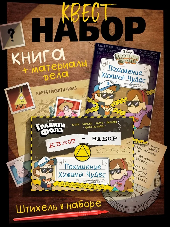 Книга-квест «Тайна Хижины чудес» — это захватывающее приключение для детей от 3 лет, вдохновлённое любимым мультфильмом «Гравити Фолз». Мягкий переплёт и формат А4 делают её удобной для использования дома или в путешествии. Этот набор подходит как для мальчиков, так и для девочек, особенно любящих тематику загадок и приключений.