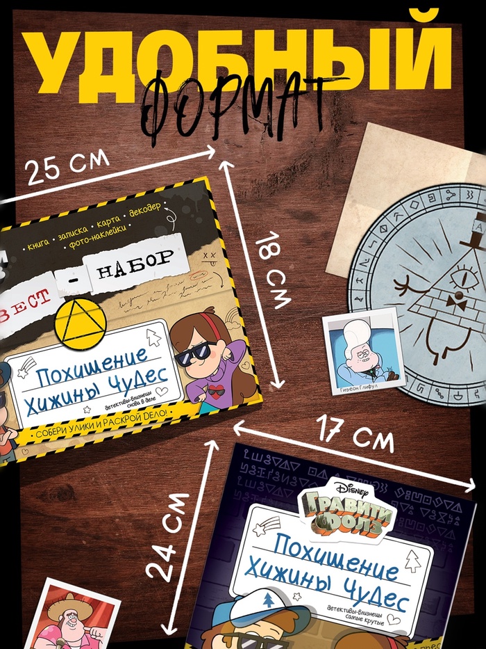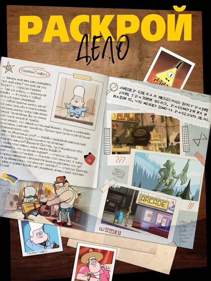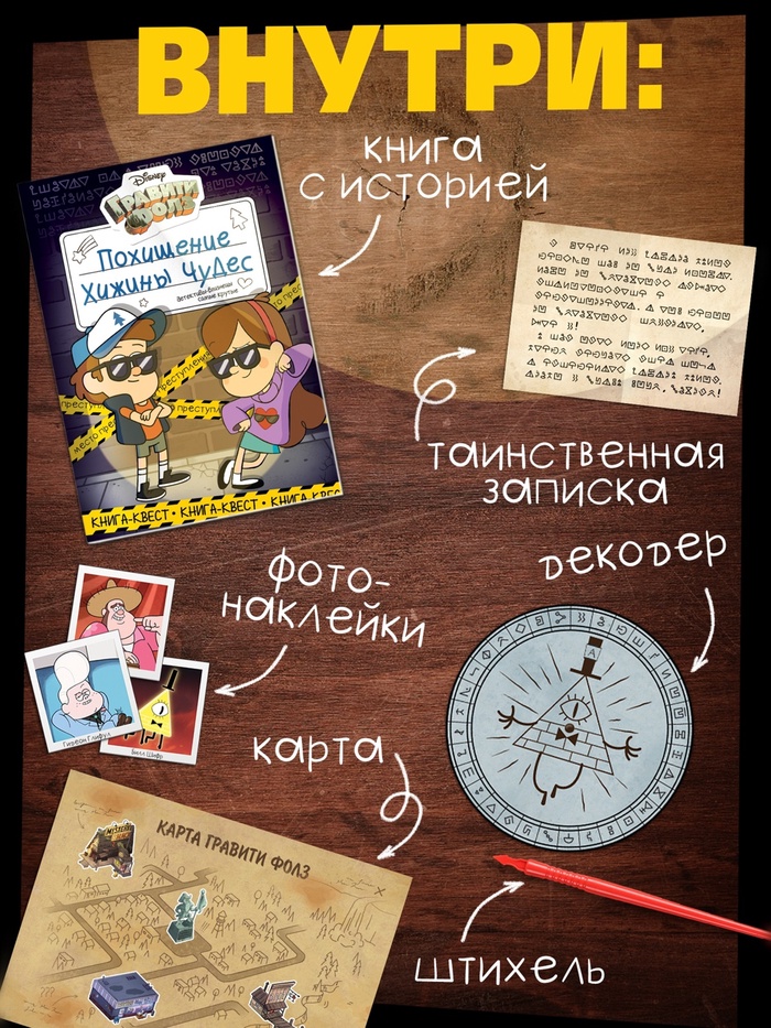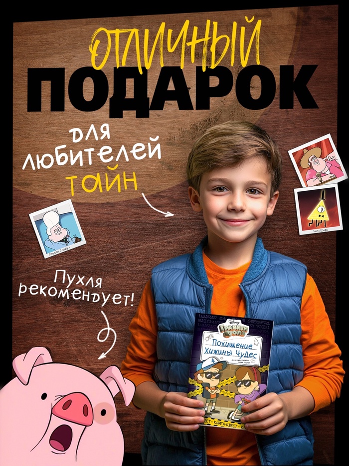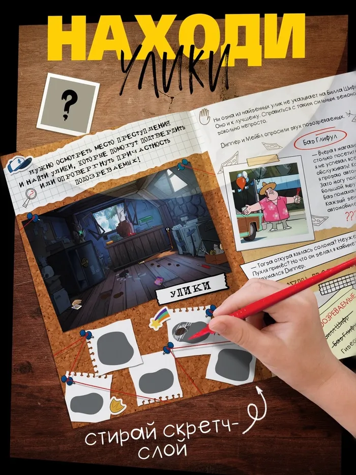 Книга-квест станет отличным подарком для маленьких поклонников «Гравити Фолз», которые любят разгадывать загадки и исследовать неизведанное. Подарите ребёнку возможность окунуться в «Тайну Хижины чудес»!