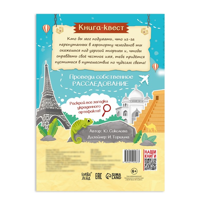 Книга-квест погрузит вас в атмосферу дальних странствий и захватывающих приключений! Представьте, что вы оказались в аэропорту. Возникла путаница, и вместо вашего чемодана с одеждой у вас оказался чемодан с украденным артефактом! Чтобы не попасть в тюрьму и не пожертвовать своей репутацией отличного детектива, вам предстоит найти злоумышленника, похитившего ценность.