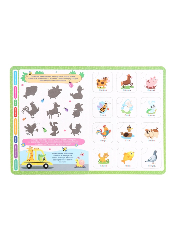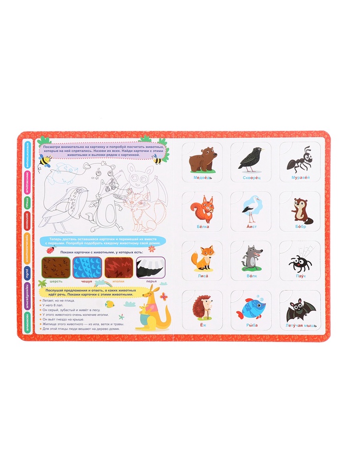 - 8 страниц с заданиями и углублениями для карточек, связанных по смыслу с картинками.