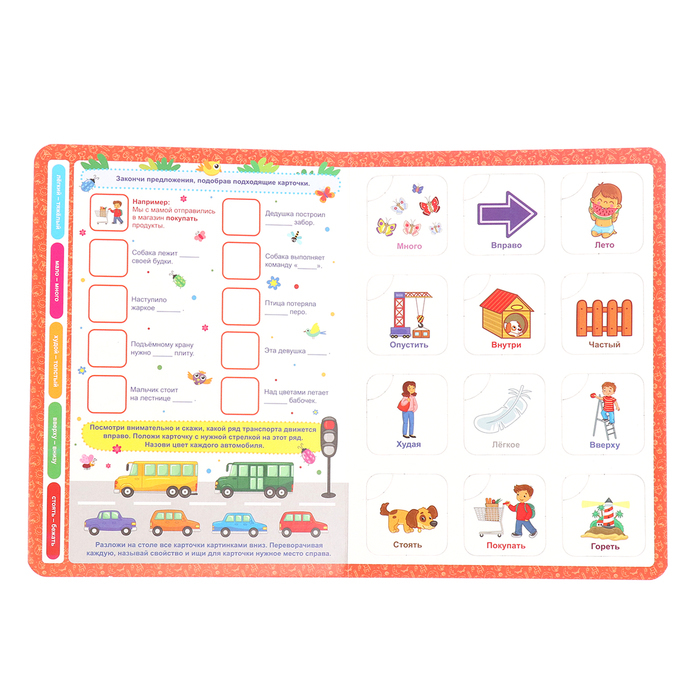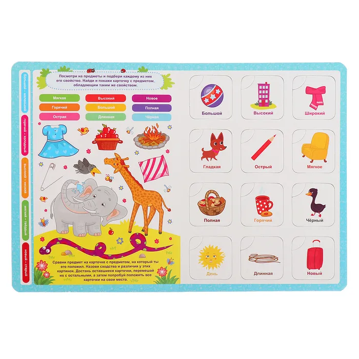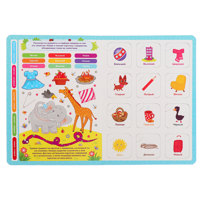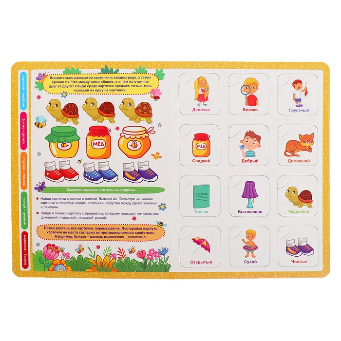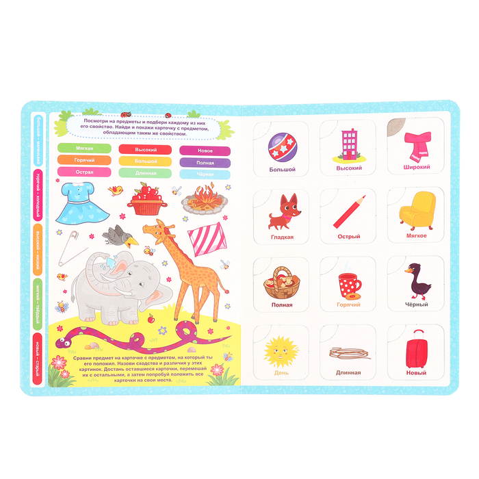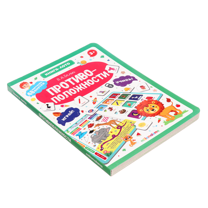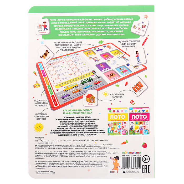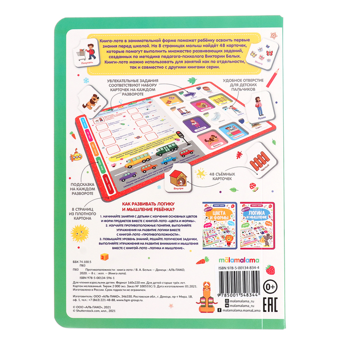 С книгой-лото «Противоположности» от торговой марки Malamalama ребёнок в занимательной форме познакомится с миром противоположностей и научится выявлять общие признаки и различия. На 8 страницах малыш найдёт 48 карточек, которые помогут ему выполнить множество интересных и развивающих заданий, составленных по методике Виктории Белых— педагога-психолога с 25-летним стажем работы с детьми.