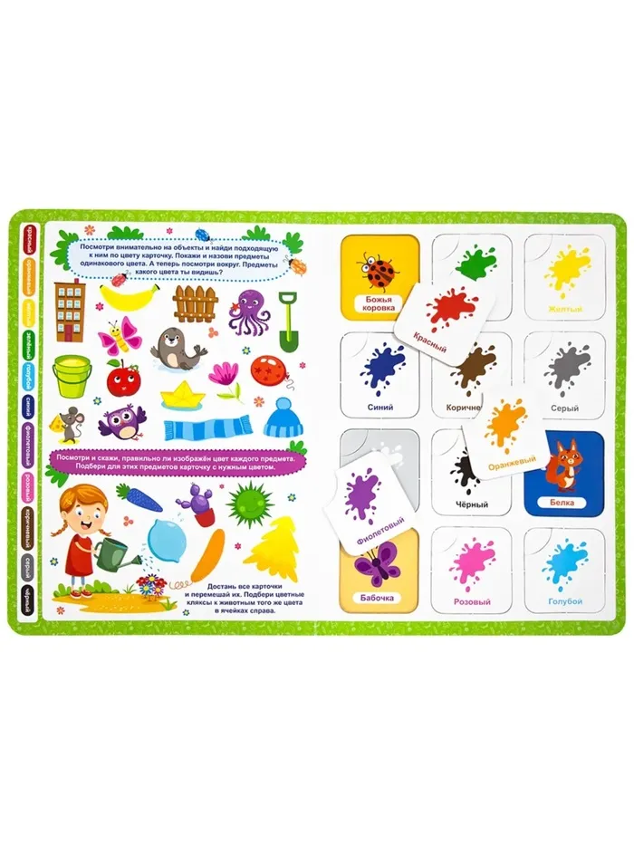 - 48 карточек помогают освоить основные цвета и формы, развивая логическое и ассоциативное мышление.