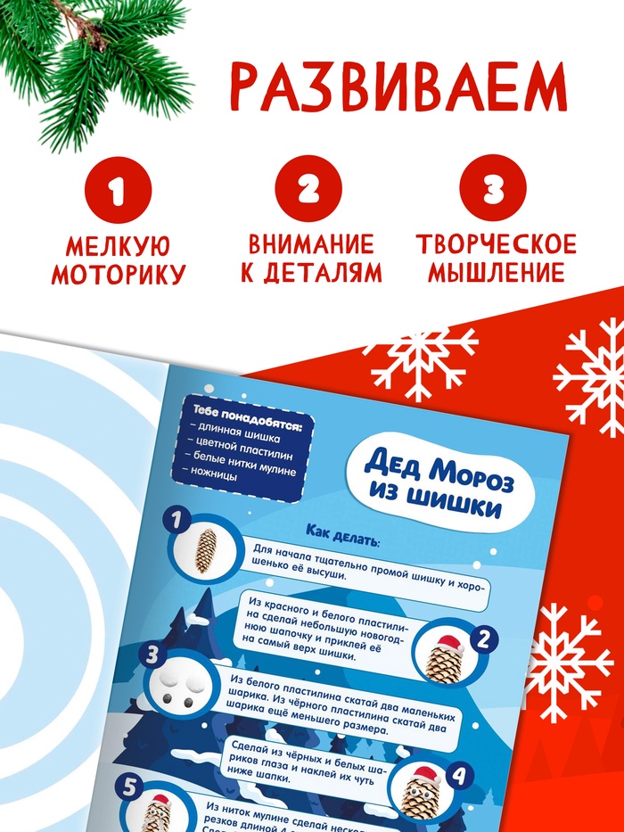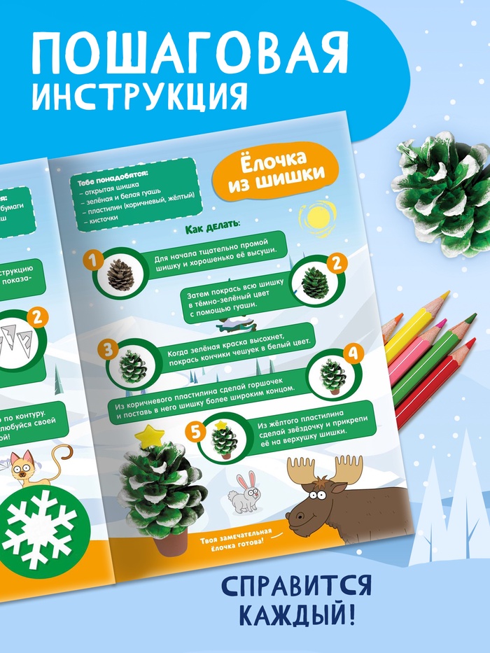 Эта книга превращает ребёнка в настоящего мастера новогодних чудес. Вместе с добрым Синим трактором малыш не просто читает — он лепит, клеит, вырезает и создаёт. Каждая из 28 страниц — это приглашение к творчеству, где шишки становятся ёлочками и Дедом Морозом, пластилин — оленем, а картон — волшебной упаковкой для сюрпризов. Такая книга учит не только думать руками, но и чувствовать себя частью праздника — здесь каждый ребёнок действительно помогает подготовить Новый год.