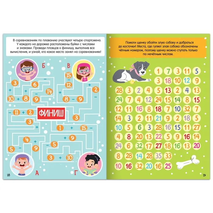 - На каждой страничке есть разные задания: решить пример и пройти лабиринт, помочь щенку добраться до косточки по кружочкам с нечётными числами и пр.