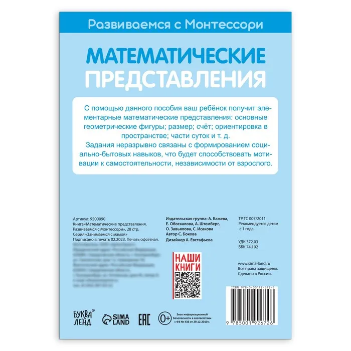 С книгой «Математические представления. Развиваемся с Монтессори» ребёнок познакомится с основными геометрическими фигурами, частями суток, научится сравнивать предметы по величине, освоит навыки счёта, ориентации в пространстве и получит другие элементарные математические представления.