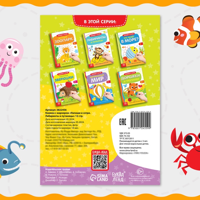 Книги с маркерами — это бесконечное удовольствие и развивающая игра в одном издании. Малыш может рисовать, обводить и выполнять увлекательные задания книжки, а затем стереть всё написанное с помощью колпачка-маркера и начать заново. Маркер легко удаляется, и любимые задания можно выполнять снова и снова.