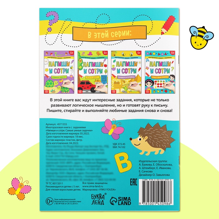 Книги с маркерами — это бесконечное удовольствие и развивающая игра в одном издании. Малыш может рисовать, обводить и выполнять увлекательные задания книжки, а затем стереть всё написанное с помощью колпачка-маркера и начать заново. Маркер на водной основе легко удаляется, и любимые задания можно выполнять снова и снова.