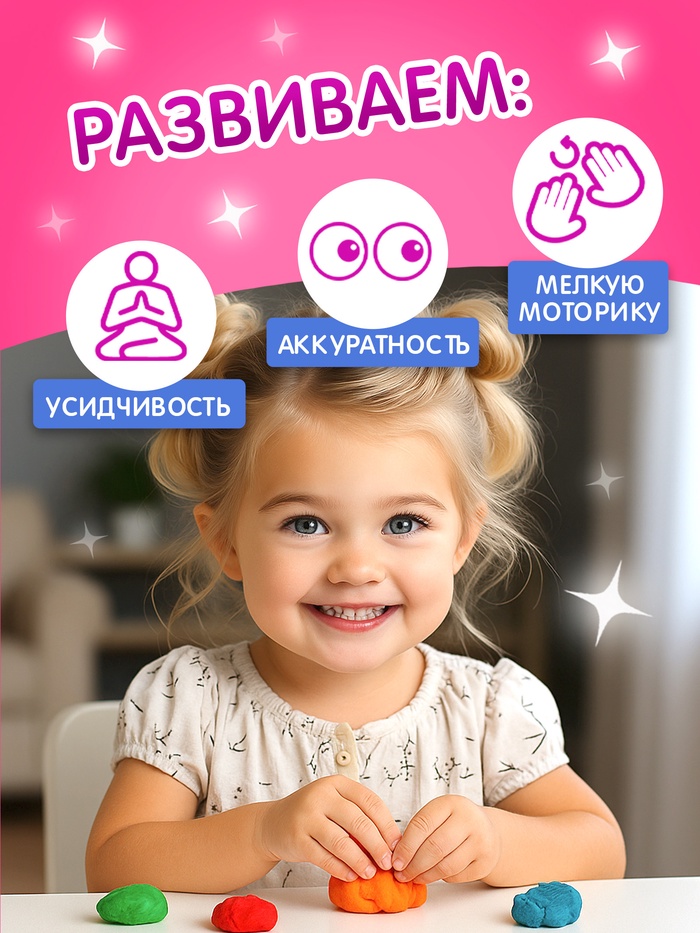 - Развитие через игру. Лепка мелкими кусочками тренирует пальцы, а подбор цветов и форм — внимание и эстетику.