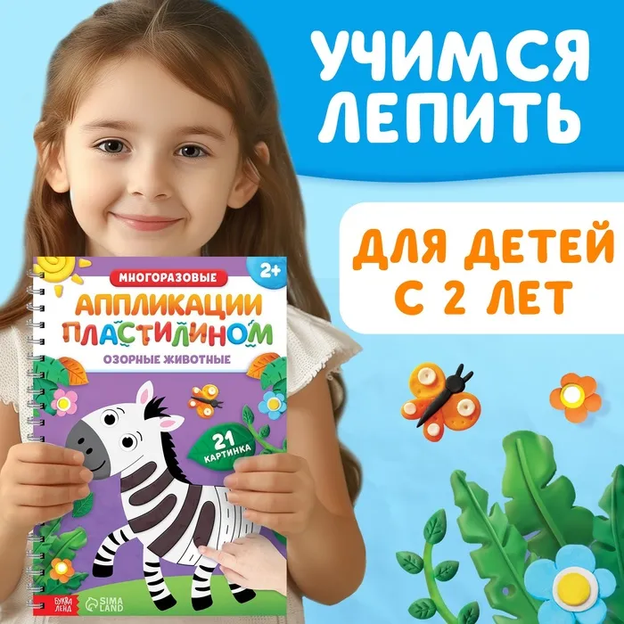 Многоразовая книга с аппликациями потренирует аккуратность, усидчивость, воображение и мелкую моторику. 21 картинка с забавными животными увлечёт малыша надолго. Делать аппликации несложно — на каждой страничке есть подсказки. Приклеивайте кусочки пластилина в обозначенные места столько раз, сколько захочется.