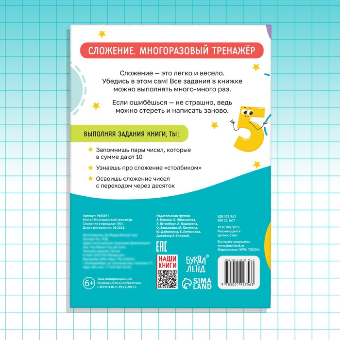Многоразовый тренажёр — удобный инструмент для дошкольной подготовки деток. С данной книгой ребёнок обучится арифметике, а именно: изучит сложение.