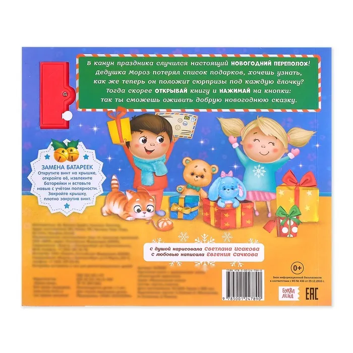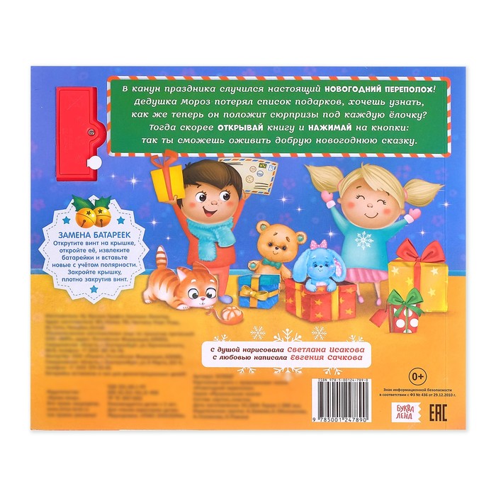 Что произойдёт, если Дед Мороз потеряет все подарки? Ответ на этот вопрос ребёнок узнает в увлекательной новогодней истории. С музыкальной книгой малыш почувствует приближение праздника. Кроха рассмотрит красочные картинки и прослушает весёлые мелодии, которые оживят сказочный сюжет.