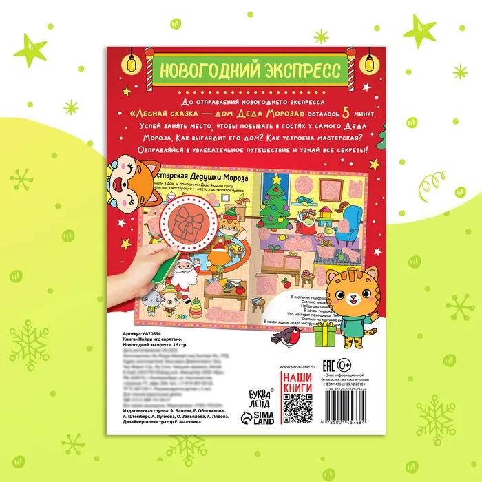 Наводите её на разные фрагменты картинок, отмеченные специальной краской, и узнайте, как выглядит дом и мастерская новогоднего волшебника. Внутри книги вас ждут увлекательные задания, красочные картинки и милые сказочные персонажи.