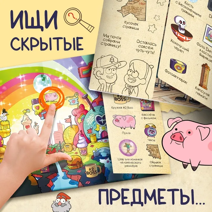 С книгой «Найди и покажи» каждое разворот превращается в новую головоломку, которая раскрывает секреты мира Gravity Falls. Это не просто книга, а настоящее приключение, которое запомнится надолго!