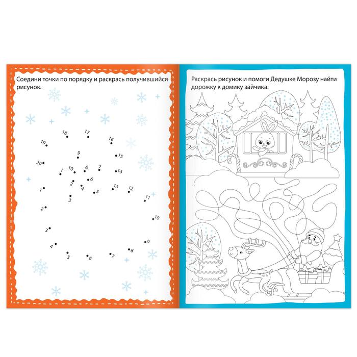 Скрасить ребёнку ожидание праздника поможет эта книга. Внутри вас ждут увлекательные задания и милые персонажи. Малыш с удовольствием раскрасит интересные картинки, поможет Деду Морозу отыскать дорогу к зайчику и выполнить другие задачки.