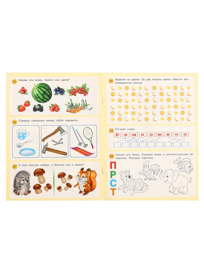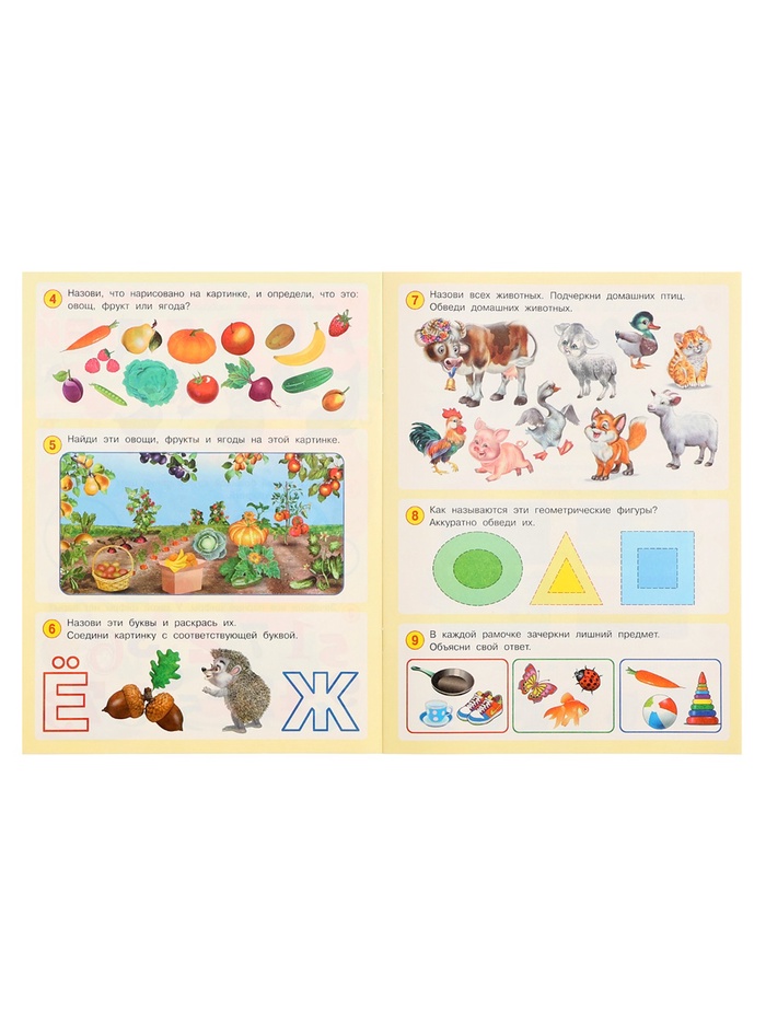 - Задания включают раскрашивание, поиск недостающих элементов, прописи, азбуку, цифры, цвета, времена года, животных и ребусы.