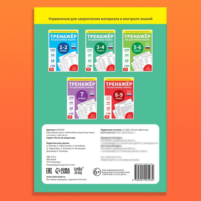 В серии книг-тренажёров по русскому языку «Тесты по возрастам» представлены также книги для 1–2, 5–6, 7 и 8–9 классов.