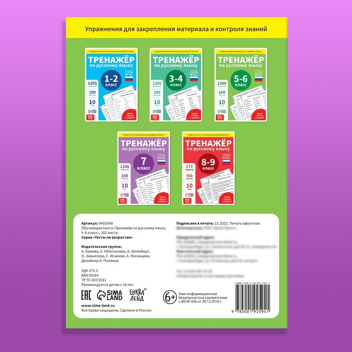 В серии книг-тренажёров по русскому языку «Тесты по возрастам» представлены также книги для 1–2, 3–4, 7 и 8–9 классов.