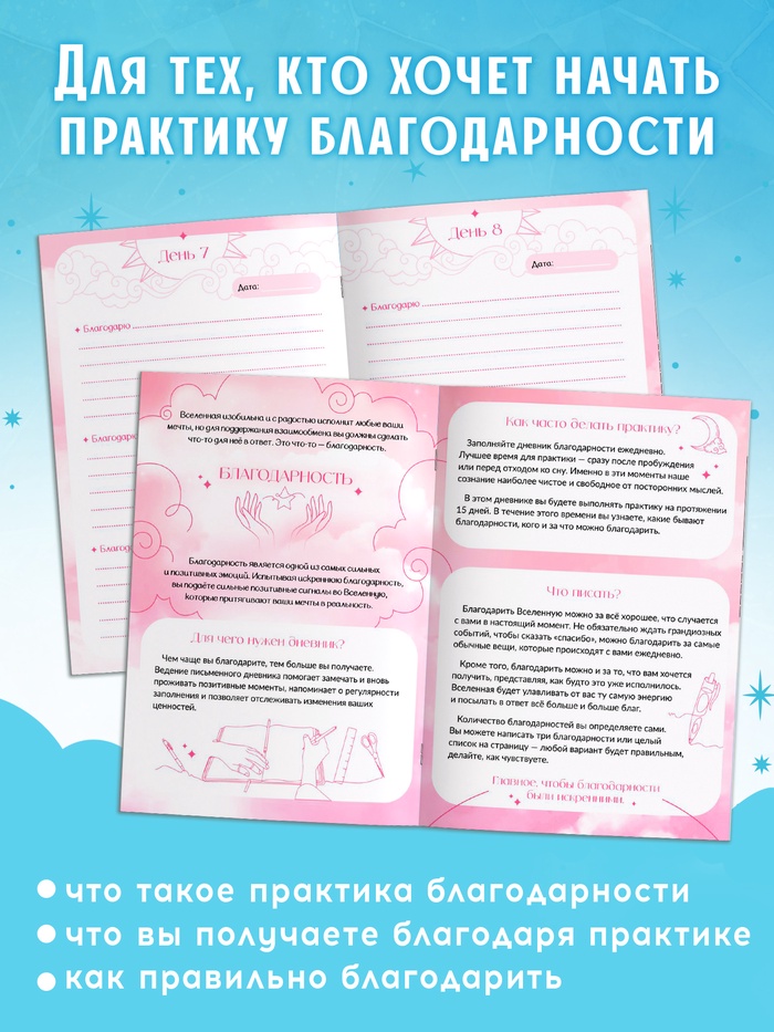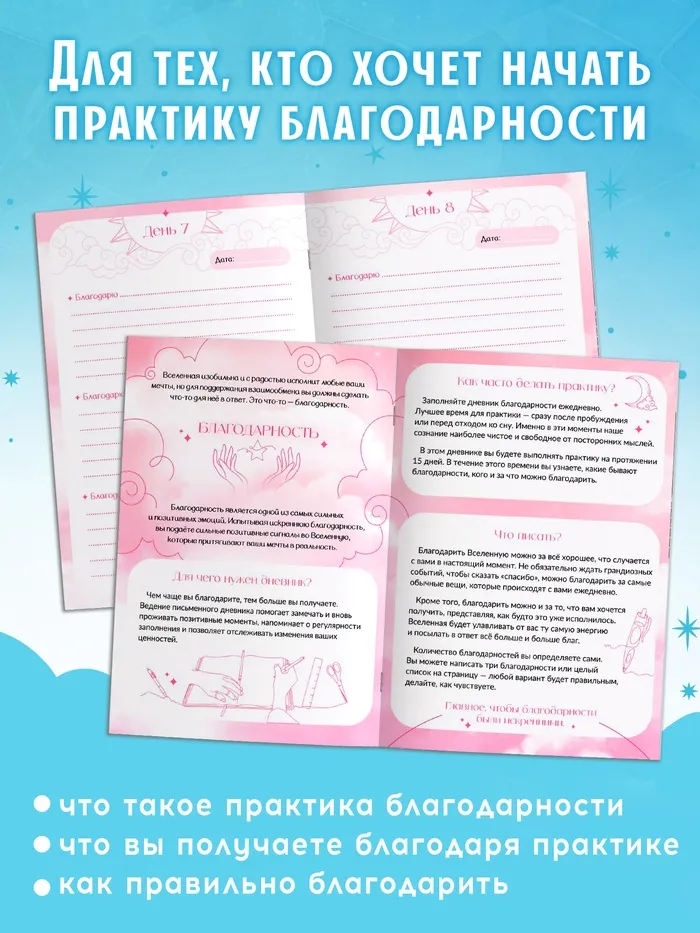 - Страницы с пошаговыми заданиями для освоения практики благодарности и страницы для ежедневного заполнения благодарностей .