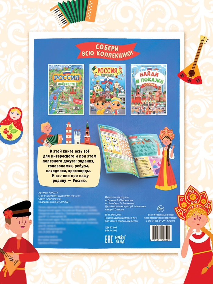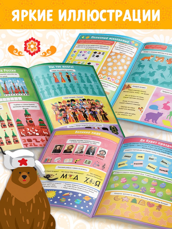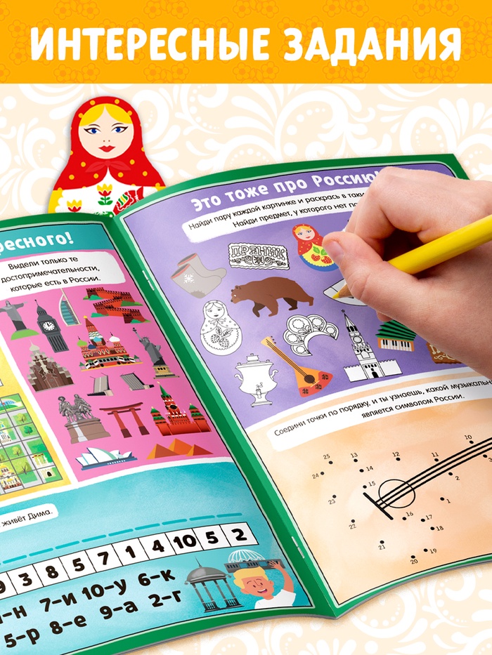 Книга с активити-заданиями поможет организовать интересный и полезный досуг для ребёнка. Внутри вы найдёте: задания, головоломки, ребусы, находилки, кроссворды. Все эти тематические задания про нашу родную страну — Россию.