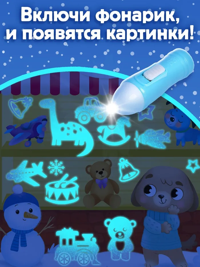 - 24 страницы с чёрными заданиями, которые оживают под светом фонарика, создавая эффект поиска спрятанных подарков и предметов.