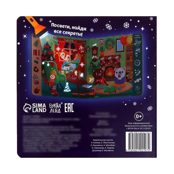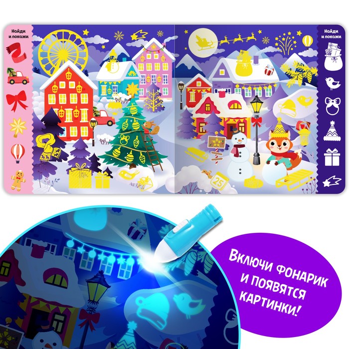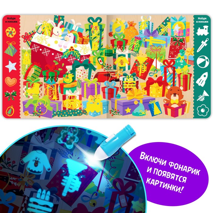 Книга с фонариком «Новогодние секреты. Посвети и найди» станет любимым занятием для детей от 5 лет. Эти страницы с загадками и скрытыми предметами помогут ребёнку погрузиться в волшебную атмосферу праздника, используя фонарик для поиска новогодних секретов.