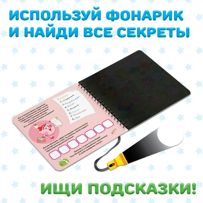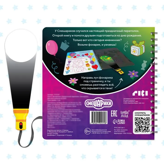 Книга с фонариком «Праздничный переполох», 22 стр., 5 игровых разворотов, Смешарики — Характеристики