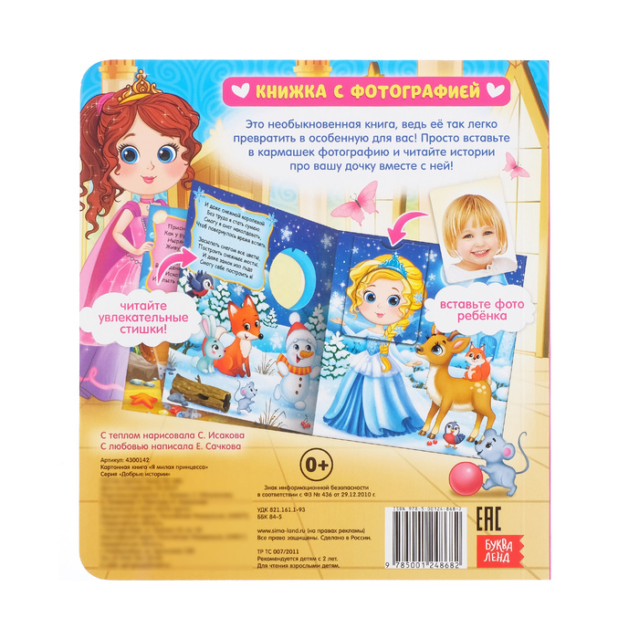 Книга написана так, будто её рассказывает сам ребёнок. Чтобы малыш стал не только рассказчиком, но и полноправным героем книги, вставьте его фото в специальный кармашек в конце издания.