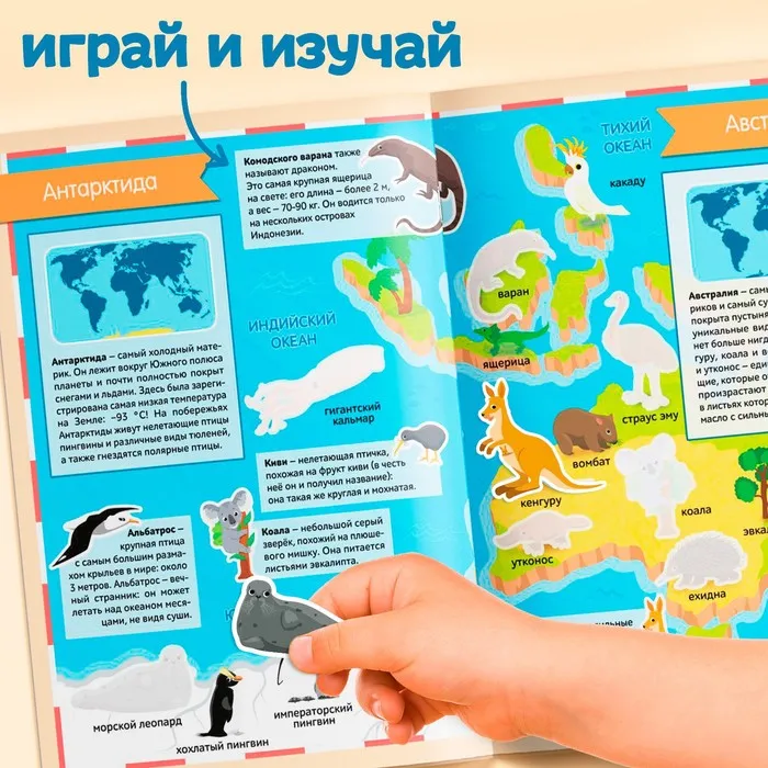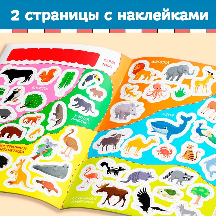 Краткие интересные факты удивят кроху и позволят узнать много нового, а наклейки превратят путешествие по страницам в увлекательную игру и помогут населить материки обитателями самостоятельно.
