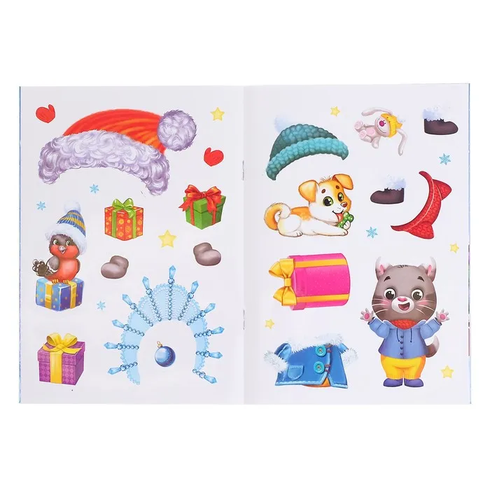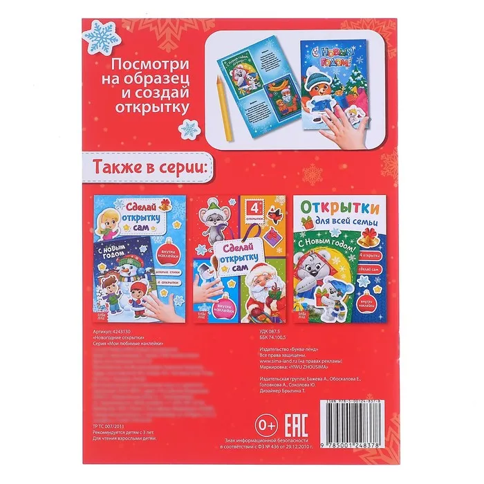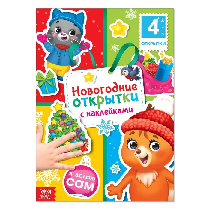 Книга с наклейками «Новогодние открытки» содержит яркие иллюстрации со сказочными персонажами. Ребёнок смастерит 4 новогодних открытки и порадует близких.