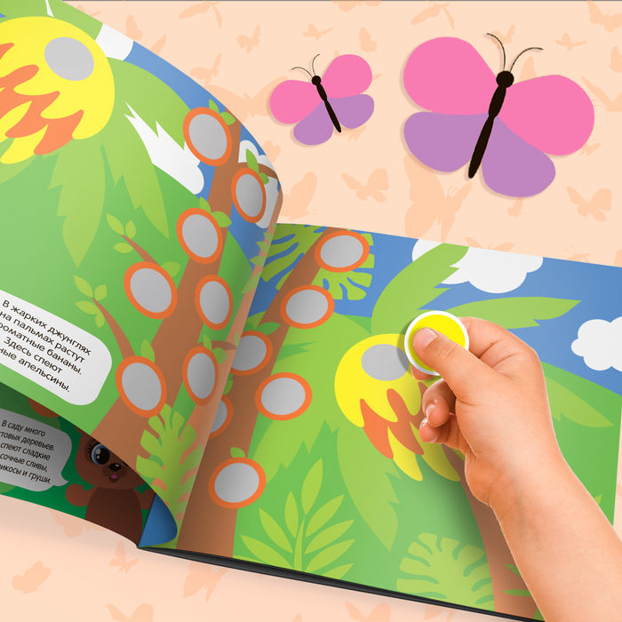 Внутри книги малыша ждут интересные задания, в которых нужно подобрать наклейки по форме, цвету и смыслу и прикрепить в определённое место.